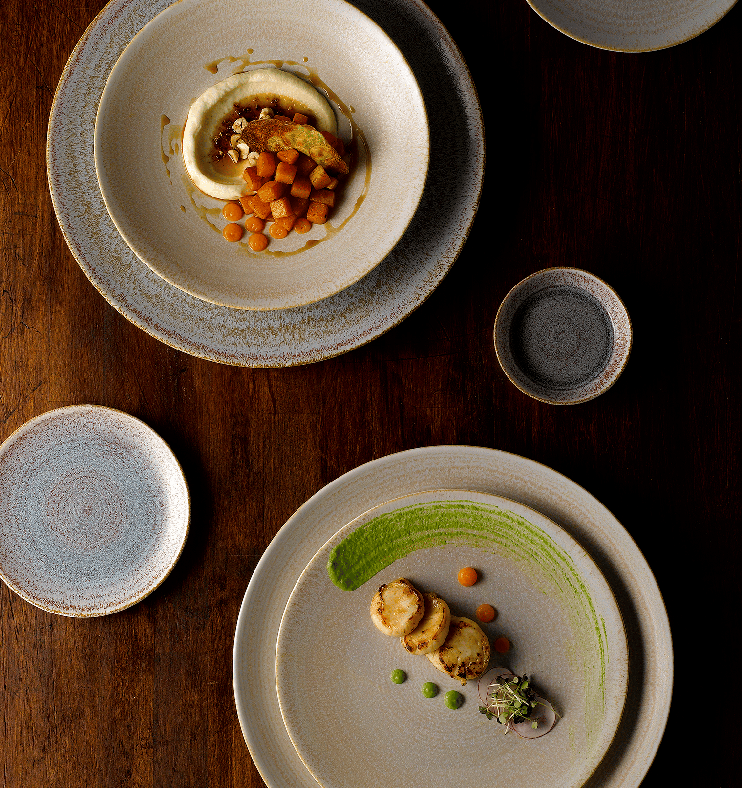 Echoing the stunning landscapes of England’s South Coast where Royal Crown Derby’s china clay is mined, highly intricate finishes provide a captivating backdrop for any chef and will spark the imagination of every diner.